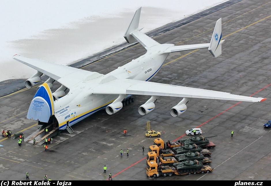 1月26日乌克兰安东诺夫航空公司一架世界上最大的安-225飞机,飞抵捷克俄斯特拉发市莫什诺夫机场,装载在捷克维修的首批4辆T-72A主战坦克,飞往尼日利亚。来源:环球网