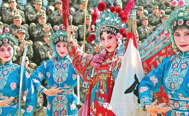南京军区某团注重将传统文化与强军文化相结合,突出军营特色,激励官兵斗志。近日,该团组织“京剧进军营”活动,受到大家欢迎。