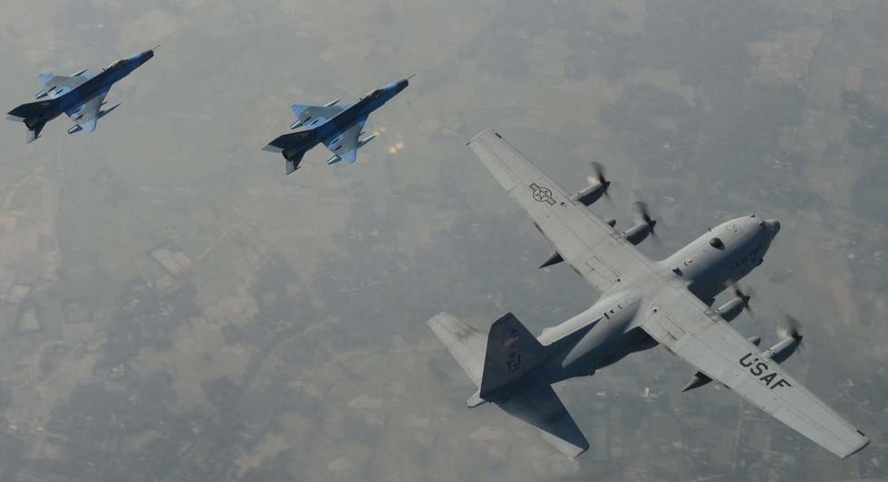 当地时间28日,在孟加拉吉绍雷甘杰附近举行了孟美联合COPE SOUTH军演,演习中,孟加拉空军第5中队的中国产歼7BG战机为美军第374联队的C-130H运输机护航,还联合进行了地面象步游行。