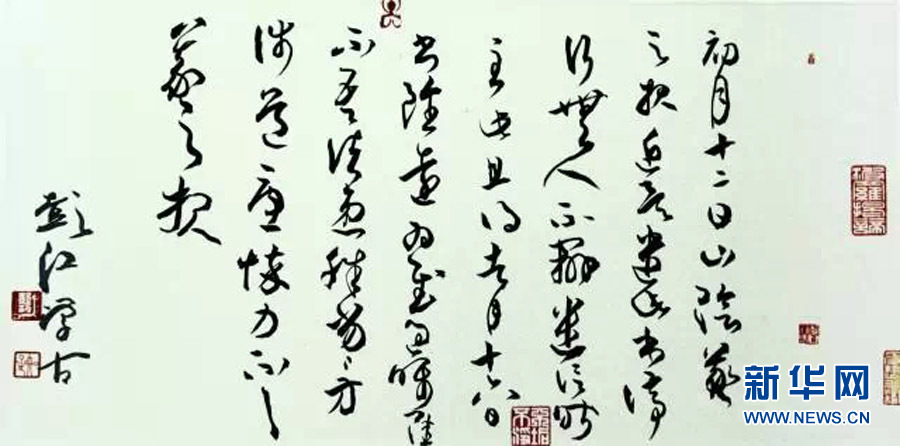 学者骆飞评价彭江的作品,形意并举,技道合一,令人思绪飞驰,感叹“书画同源”之微妙。巨幅《滚滚长江东逝水》惊心动魄,卷风掀涛,带着清新之气、阳刚之美、不竭之力,让人欣喜不已。(黄玮)