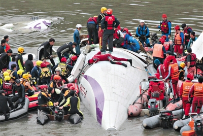 昨日下午,救援人员试图营救复兴航空坠河班机中的乘客和空乘人员。新华社记者 金立旺 摄