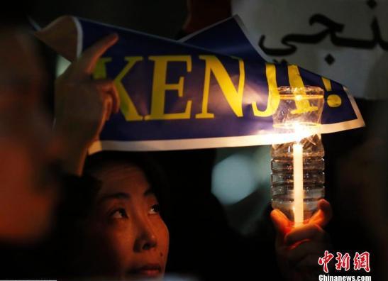 当地时间2015年1月30日,日本东京,民众聚集在首相官邸前集会,点燃蜡烛手持标语牌,要求极端组织“伊斯兰国”释放遭绑架的日本人质。