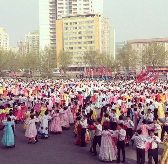 朝鲜人参加在平壤举行的大型舞蹈活动。