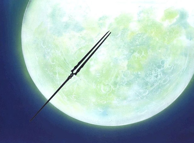 “朗基努斯之枪”是EVA中人类抗击反派“使徒”的重要道具,在零号机攻击位于卫星轨道上的第十五使徒时,插入月球成为不可回收的状态。