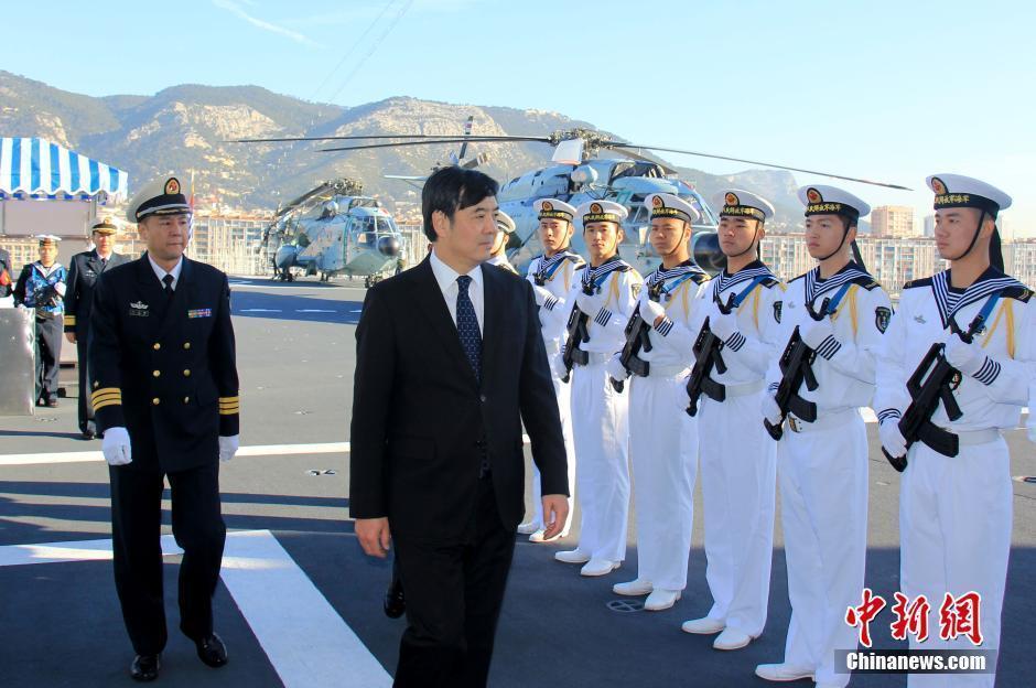 当地时间2月9日上午,在法海军“比罗司令”号护卫舰的引导下,中国海军第十八批护航编队长白山舰、运城舰、巢湖舰驶入土伦军港码头,开始对法国为期4天的友好访问。图为长白山舰驶入土伦军港。中新社发 甘俊 摄