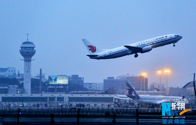 2月6日,重庆江北机场,一架飞机正从机场塔台前起飞。