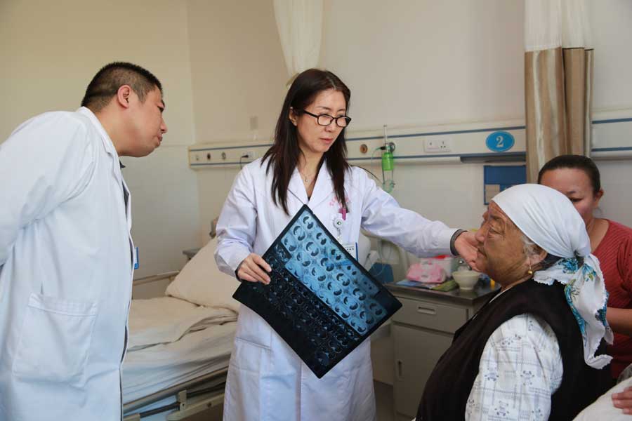 2月5日,新疆阿勒泰地区富蕴县人民医院副院长吴艳彬(左二)在为病人检查病情。丁宁 摄