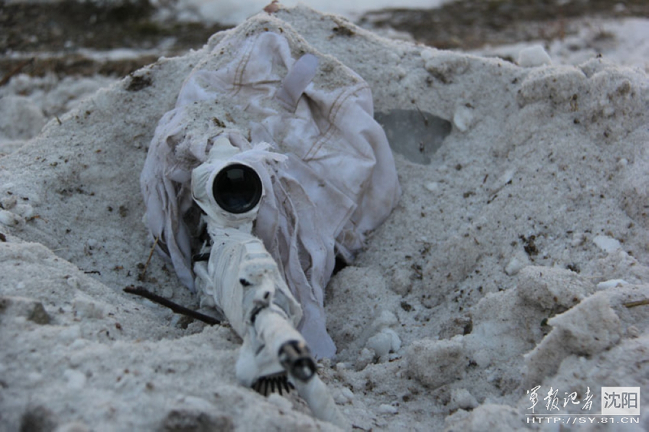 最后在回到东北,解放军战士将身体埋在雪中,白色帽子掩盖头部,枪支也满缠白色布条,进行伪装狙击。图片来源:军报记者网。