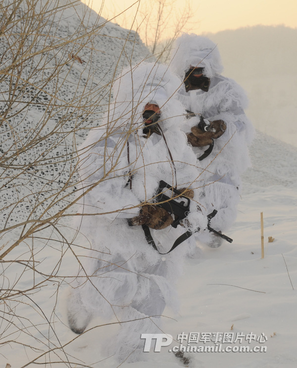 此前也有不少解放军身穿“高大上”的雪地吉利服训练画面。图为2013年1月,解放军在长白山腹地演习画面,官兵身着吉利服出没在林海雪原深处,他们身后是由伪装网遮盖的装备,看上去与雪丘无异。图片来源:中国军网 冯凯旋 摄