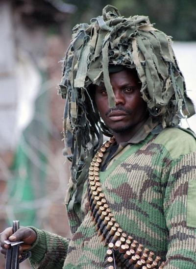 当地时间2013年7月17日,刚果,身穿伪装服的士兵。再次声明,头上顶着的不是拖把。