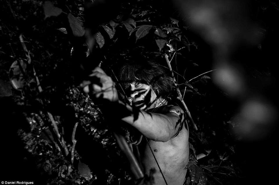 Awa-Guaja部落成员Muturuhum使用弓箭在亚马逊热带雨林中打猎。