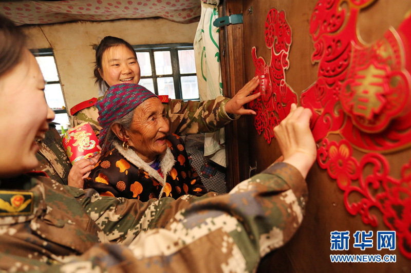 16日上午,西藏边防总队聂拉木边检站组织官兵来到驻地樟木镇迪斯岗孤寡老人次仁卓玛家中,与老人一起张贴“羊”年贴画、“福”字、春联,除旧迎新,喜迎新年。 (郑永波 李俊鹏)