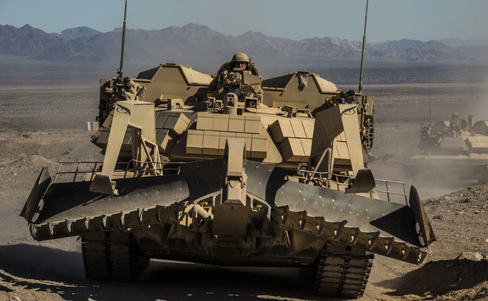 2015年2月15日,美国海军第三海军陆战队远征部队,第3陆战师,第3陆战团,第2营士兵正在进行实战演练。参演部队动用了包括M1A1主战坦克、重型清障车、AAV7两栖战车等威力强大的陆战武器。在空中运输方面,陆战队动用了CH-53E超级种马重型直升机