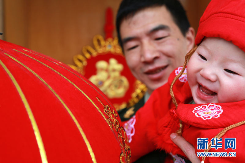 除夕,西藏边防总队聂拉木边检站郑军与来队探亲的女儿一起在门前挂“福”字和灯笼喜迎新春佳节的来到。(郑永波)