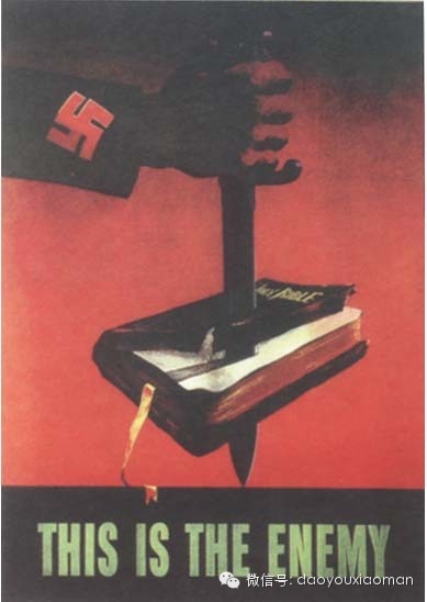 画面上一把德国纳粹刺刀穿透了《圣经》,形成了一个变形的倒十字。这就是敌人的所作所为,亵读《圣经》和基督,对人性进行扭曲和摧残。