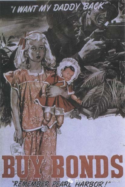 这个女孩的父亲上了前线,正在与日本法西斯激战,死神随时都有可能光顾他。为了尽快结束这场可恶的战争,让这个令人怜爱的小女孩早日见到他的父亲,购买战争债券吧!这张海报最底下一行写的是:“牢记珍珠港” 。