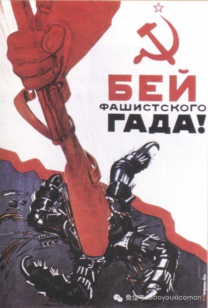 图中法西斯被描绘成带着铁钩和毛刺的爬虫,在俄军的枪托下被砸烂。此海报画面极具动感,令人仿佛听到了有力的击打声。