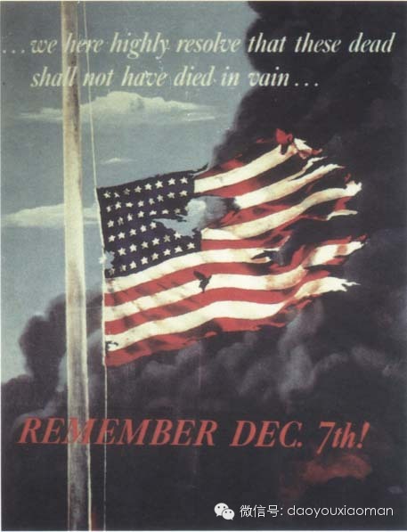 1941年12月7日,日本人不宣而战,以舰载机突袭了位于太平洋瓦胡岛上的珍珠港,重创美国太平洋舰队,揭开了太平洋战争的序幕。海报上的话摘自林肯的《盖茨堡演说》。