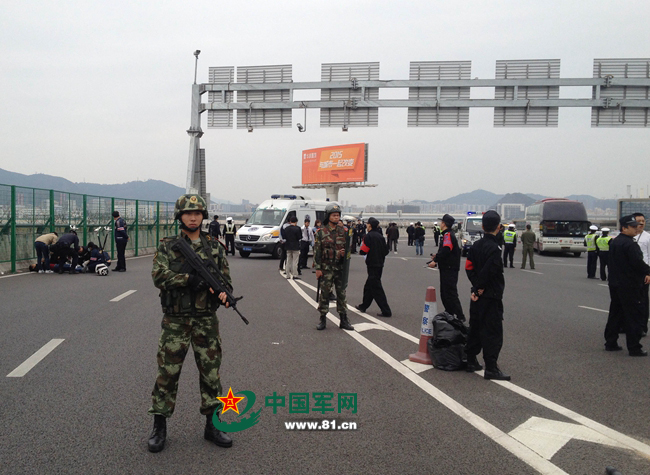 边防官兵正在现场进行外围封控,疏散围观群众。