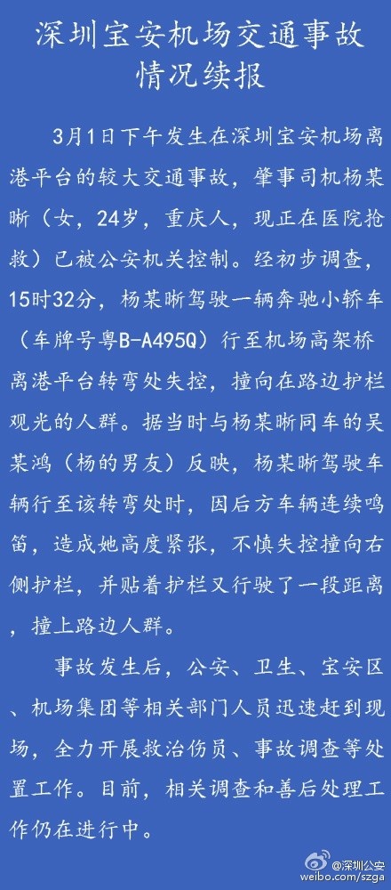 3月1日15时32分,一辆奔驰轿车在深圳宝安机场离港平台失控撞向护栏,截至当晚23时许,已造成9人死亡、23人受伤。事故发生后,24岁的肇事司机杨某晰已被警方控制,目前事故仍在进一步调查中。