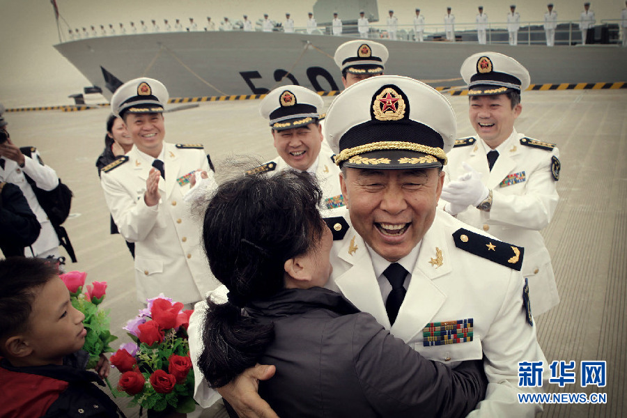 2010年11月2日,第七批护航编队启航前,编队指挥员、时任东海舰队副司令员张华臣少将与妻子热情相拥。作为一名高级军官,估计只有在码头才会有这样的感情流露,等他踏上舷梯,肩上便只有责任。琚振华 摄