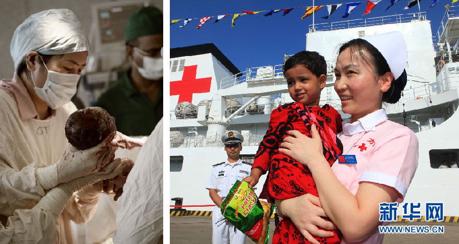 (左图)2010年11月12日,孟加拉国吉大港一名患有先天性心脏病的产妇杰娜特·福图斯临近分娩。正在吉大港执行“和谐使命—2010”医疗服务任务的和平方舟立即组织专家及护理人员,赴孟海军帕腾加医院为杰娜特实施剖腹产手术。为表达对中国军医的感激之情,孩子的父亲阿努瓦·霍森为女儿取名为“中国”(当地语言为chin)。(右图)2013年8月22日,已经3岁的加拉小女孩“中国”在父母带领下登上再次访问孟加拉的和平方舟,专程赶来谢恩人,并与当年参与手术的护士王芳合影。琚振华 摄