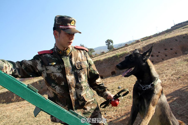 3月2日,90后警犬训导员下士马瑞鑫和上等兵王盛,他们俩正在组织警犬“大脚”进行过障碍和捕扑训练。过障碍、练捕扑、搜寻爆炸物……这些都是“大脚”的份内工作。训导员马瑞鑫、王盛即是“大脚”最亲密的“战友”,又是最严格的“导师”。