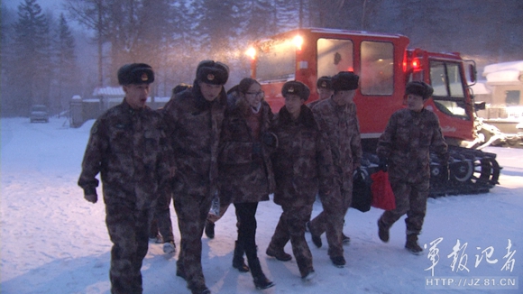 2月14日,军嫂魏天经历数十小时的周转颠簸后终于登上了无数次在梦中相见的边防哨所,与丈夫董志鹏团聚,图为哨所官兵迎接嫂子下车。