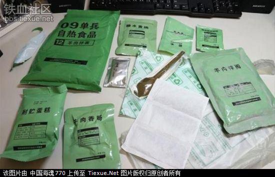 解放军09式单兵自热食品组合:牛肉香肠,蛋糕,糖水黄桃。主食:羊肉拌面。