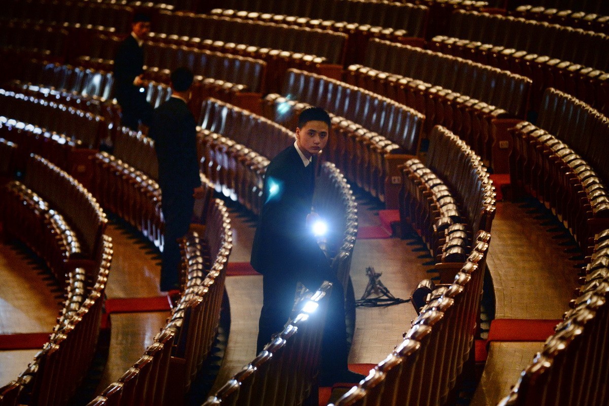 2015年3月3日,北京人民大会堂,中国人民政协会议开幕式后,安保人员检查会场的。AFP PHOTO / WANG ZHAO