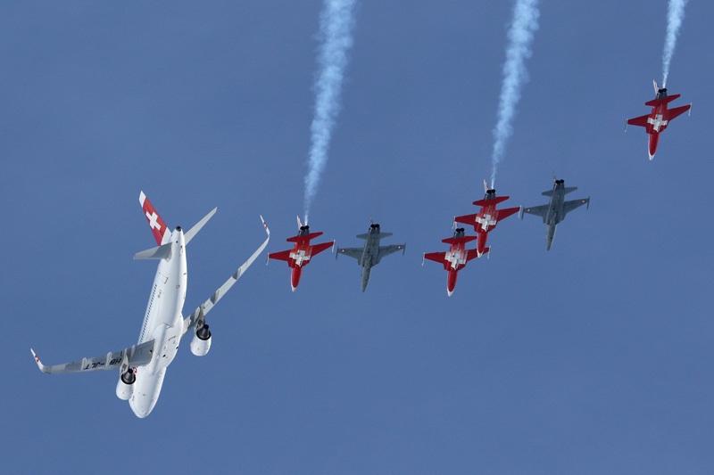 一架空客A320与瑞士空军飞行表演队的6架F-5E战机在雪山之巅做飞行表演。