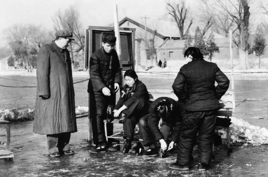 1953年,毛泽东和女儿李敏在中南海滑冰场上。