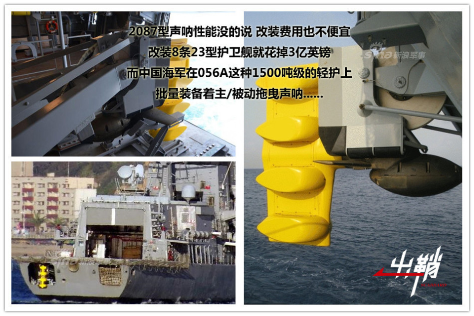 所以如今西方国家水面舰艇开始采用主/被动拖曳声呐相结合的方式。用低频主动声呐发射信号,用拖曳线列阵声呐来接收,如此获得远距离探测和定位的良好效果。例如本图中英国海军在23型护卫舰上装备的2087型声呐,以及法国海军在其最新型“阿基坦”护卫舰上装备的声呐均属此类。