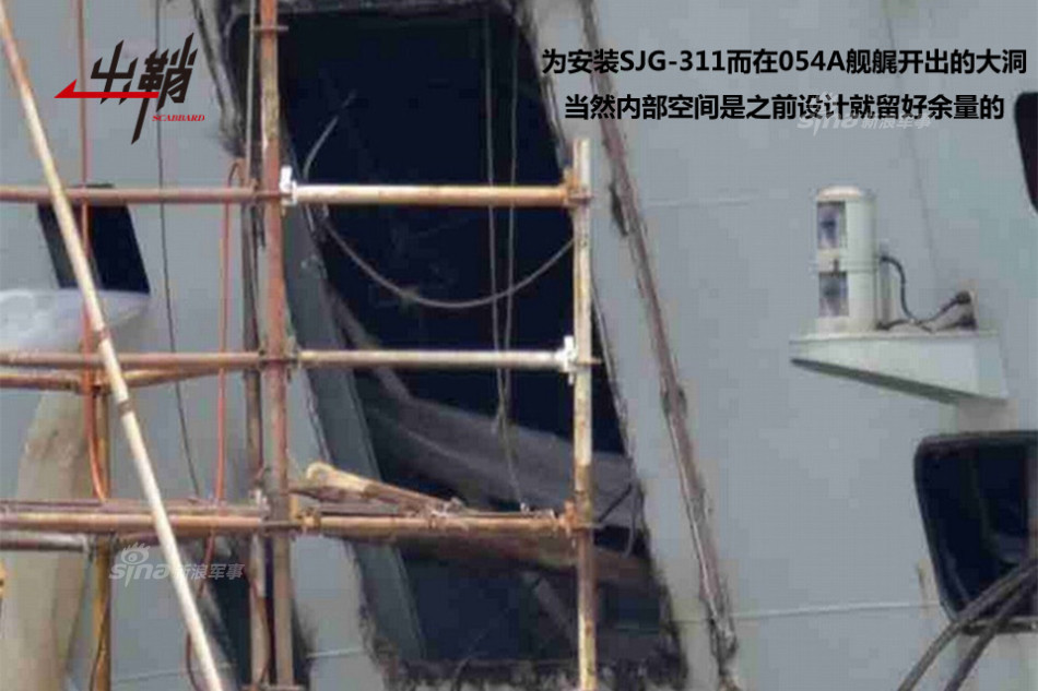 从第17艘开始,改进型054A型导弹护卫舰均在舰艉左侧增加了一个开口,用于收放最新的SJG-311型主动拖曳低频变深声呐。舰艇的反潜系统包括水声系统和反潜武器系统,其中水声系统中的声呐设备一般分为舰壳声纳和拖曳声呐两种,后者可大致分为主动变深声呐和被动线列阵声呐两大类。