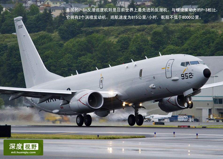 南海已不是美军想来就能来-----美国的P-8A反潜巡逻机则是目前世界上最先进的反潜机,与螺旋桨动力的P-3相比,它拥有2个涡喷发动机,巡航速度为815公里/小时,航程不低于8000公里。