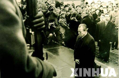 1970年12月7日,联邦德国前总理勃兰特双膝跪在波兰犹太人死难者纪念碑前。