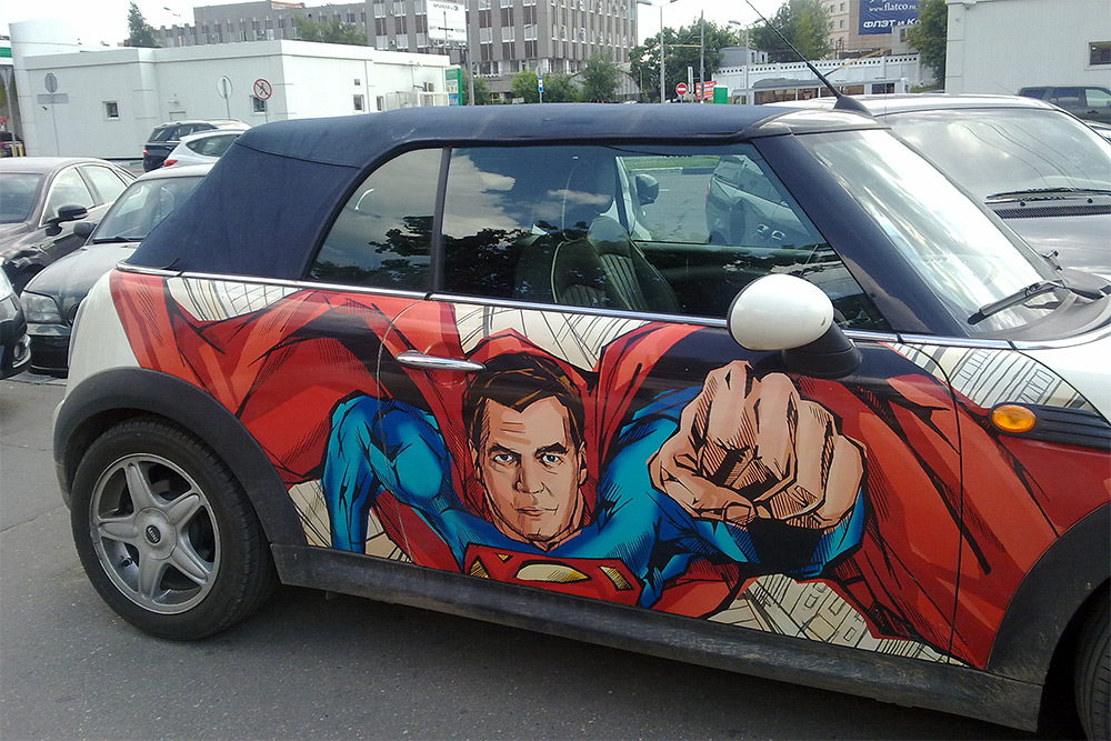 俄罗斯街头创意涂鸦车:“蝙蝠侠普京”萌萌哒