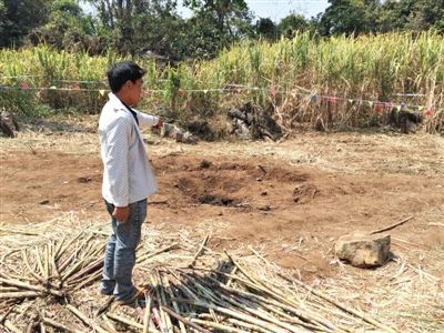 昨日,在大水桑树村,村民向记者展示13日造成5死8伤的炸弹事件弹坑。