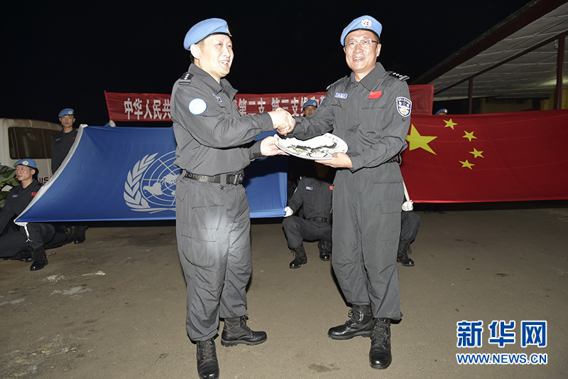 3月11日凌晨4时46分,在鲜艳的五星红旗、湛蓝的联合国旗前,在中国驻利使馆、公安部轮换工作指导组等人员和两支维和防暴队队员的见证下,中国第二支驻利比里亚维和警察防暴队政委赵东方和第三支驻利比里亚维和警察防暴队政委李培森进行交接。握手、拥抱、赠送纪念品,简洁、庄重,具有历史意义的重要一刻就这样“低调”完成了。这意味着,第二支维和防暴队圆满完成了维和任务,第三支维和防暴队接过了履行国家使命、维护世界和平、展示中国警察形象的重任。