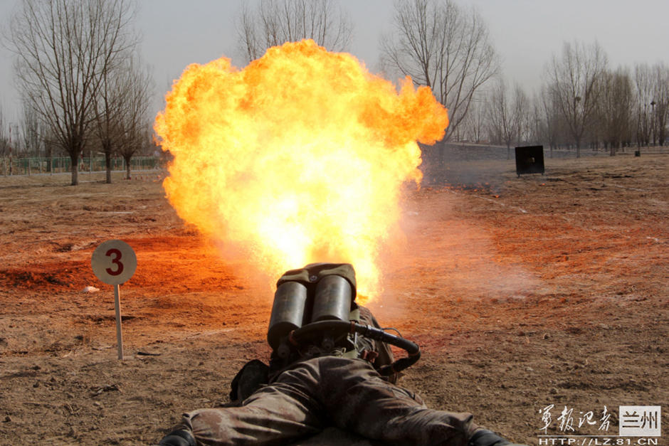 近日,兰州军区某红军师组织专业科目训练,在训练中采取理论讲解、模拟训练、实际操作等训练方式,全面提高官兵训练水平。图为:喷火兵进行喷火训练,场面酷似“火龙出世”。