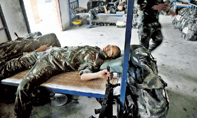 出过早操,队员们利用点滴时间休息。即使在休息的时间,战士们也处于随时准备战斗的状态。