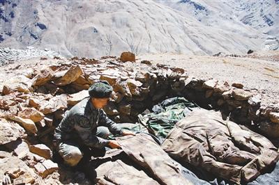 后来,一些官兵在冻土上挖地窝子,用石块在四周垒一圈挡风,改善了住宿条件。中士杨耀龙是第一个挖地窝子的人,也是地窝子挖得最好的:他的地窝子底部平整。战友羡慕他的居所是5570高地“最‘豪华’的‘标准间’”。