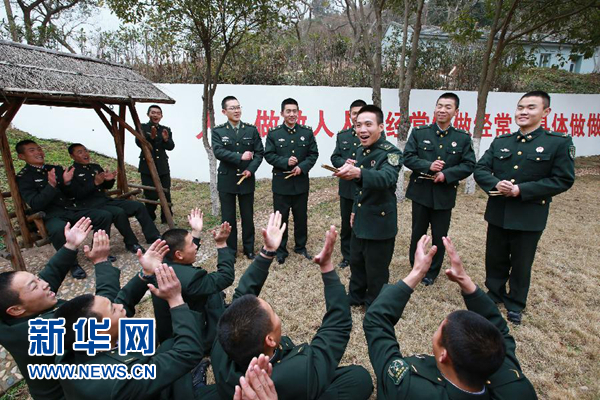 南京军区“思想工作模范连”快板组成员为新战友们表演快板(1月30日摄)。 新华社发(叶丽君 摄)