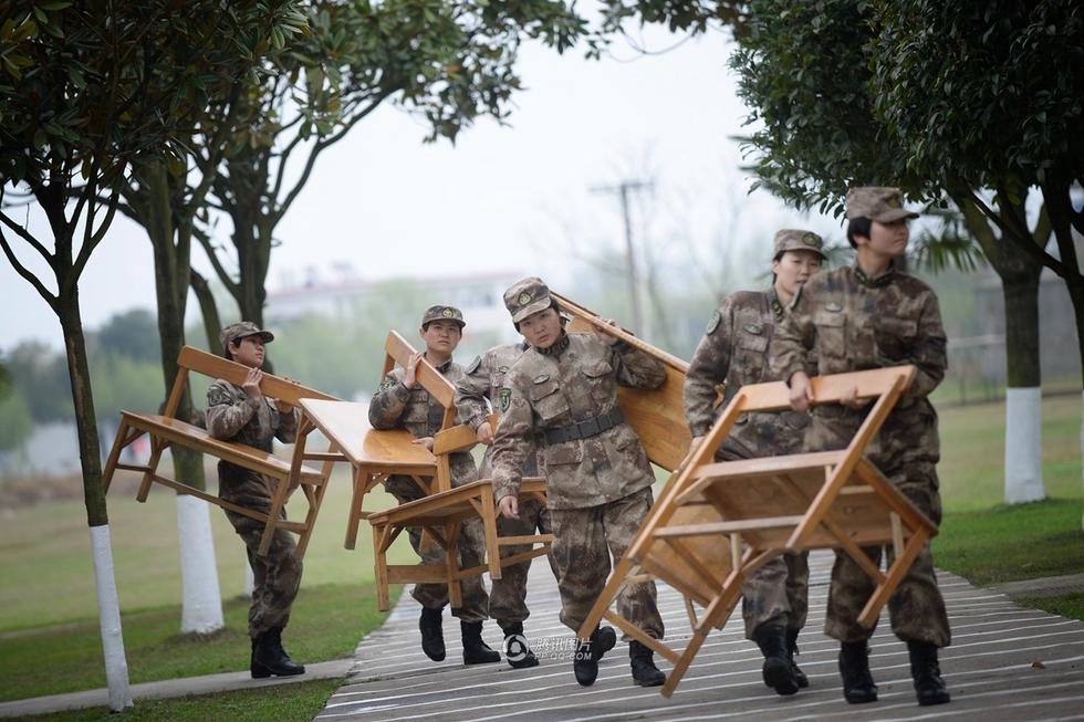 女兵们个个都是女汉子,每个人独自搬一条大凳子不在话下。