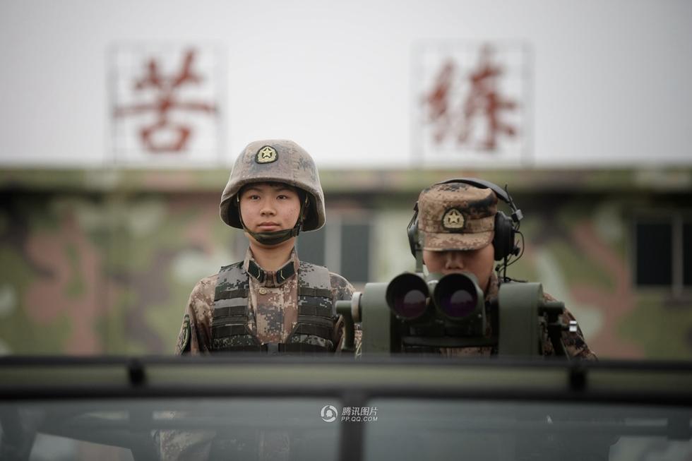 女兵站在车上寻找目标,身后“苦练”两个字非常显眼。