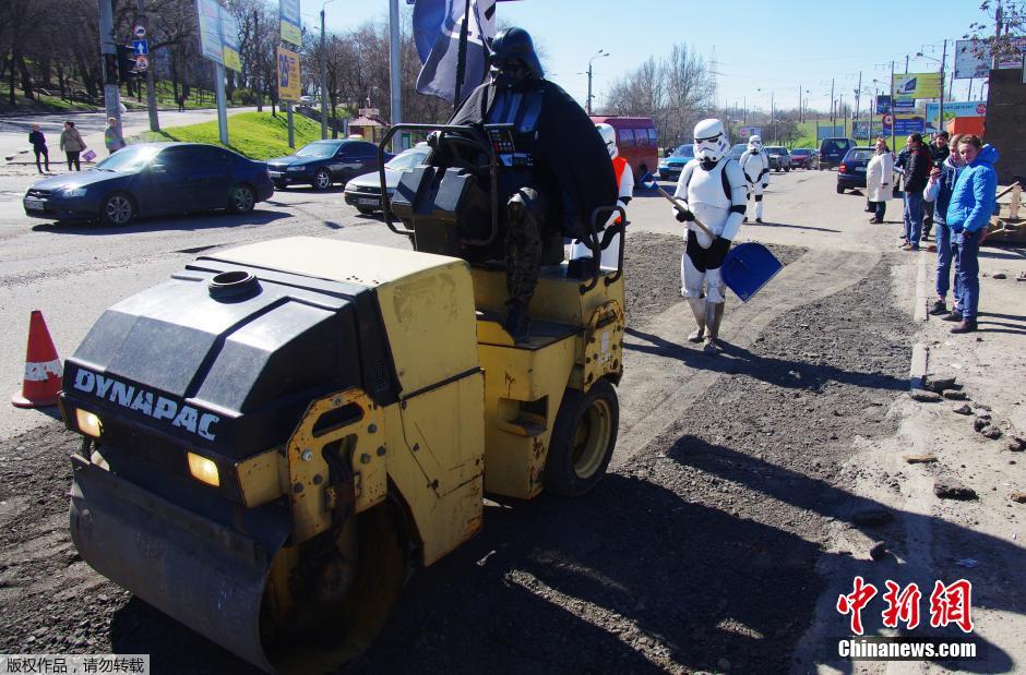 乌克兰网络党领袖扮黑武士 开轧路机修马路
