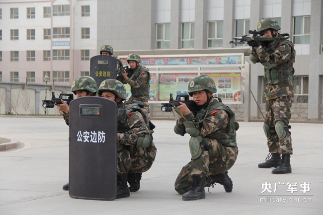 雪豹突击队精锐特战兵持枪拿盾西单街头保两会