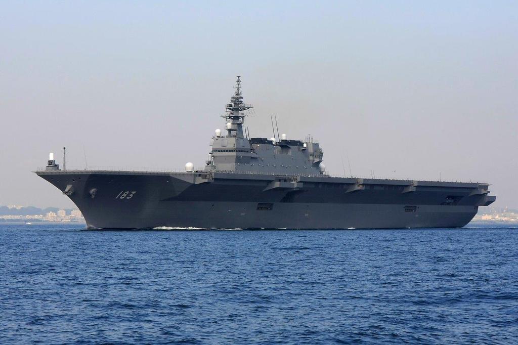 当地时间3月25日上午9时,日本海上自卫队最大舰艇22DDH出云号在海洋联合公司横滨矶子工厂交付。这艘满载排水量27000吨的直升机航母是日本自卫队拥有的最大舰艇。图为即将交付的“出云”号。
