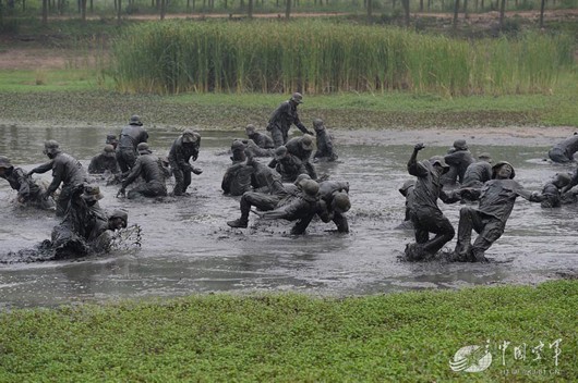 模拟战场环境,队员们在泥潭中进行摔跤训练。