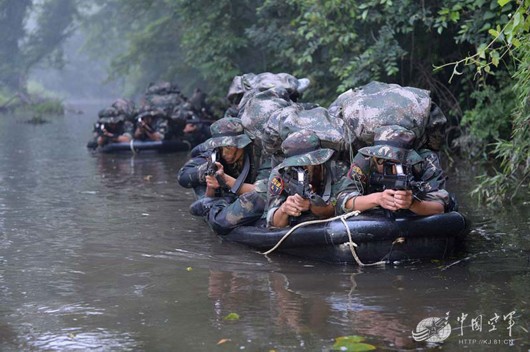 清晨,队员们乘橡皮艇沿着河道秘密向“敌”后渗透。